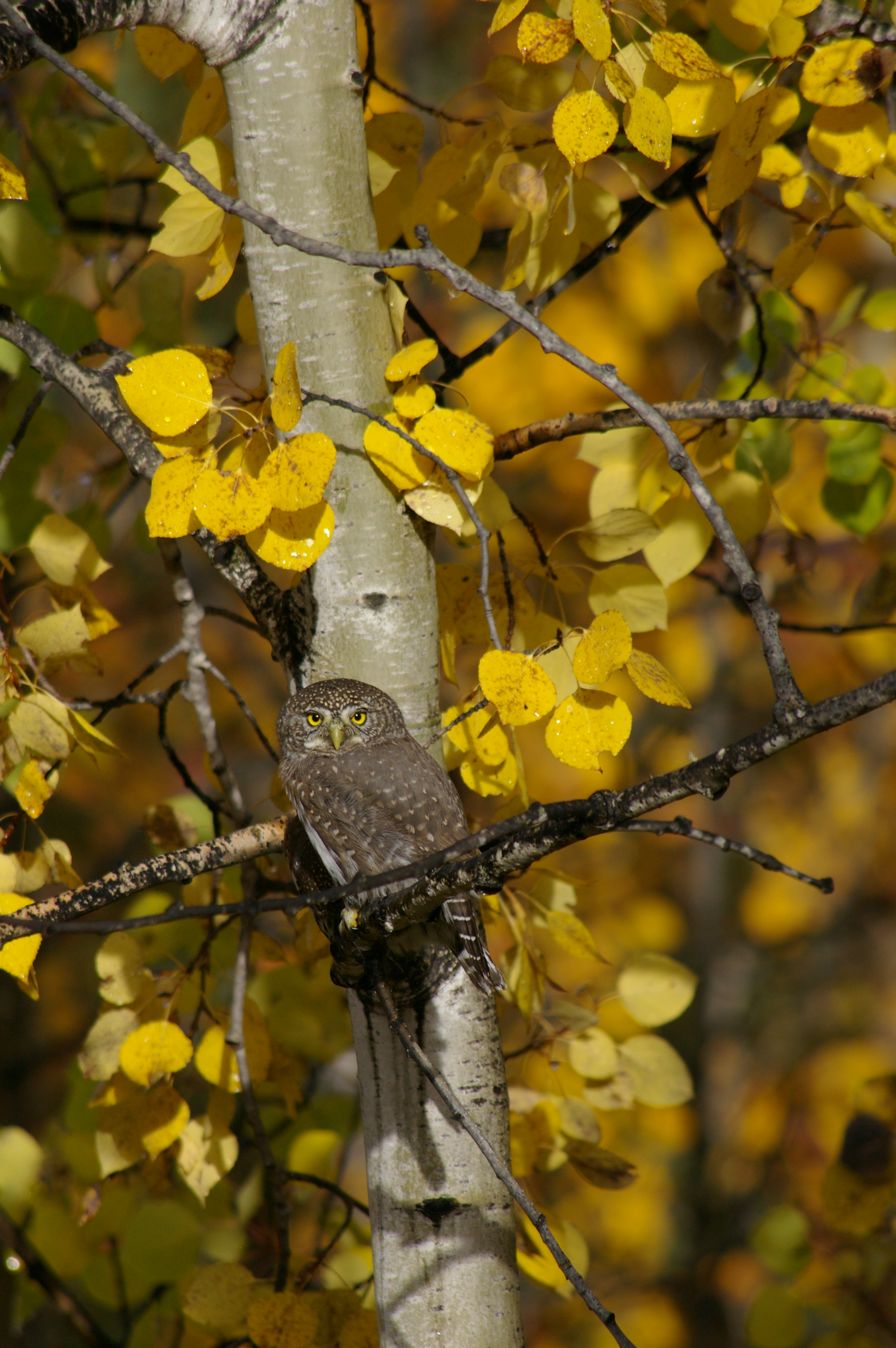 Ken and I were enjoying our ritual coffee on the front deck this past week when Ken spotted an unusual bird landing in our aspens. Luckily we had our binoculars on hand and were delighted to see a tiny pygmy owl! We weren’t given much time to look at him before he flew off to another destination.