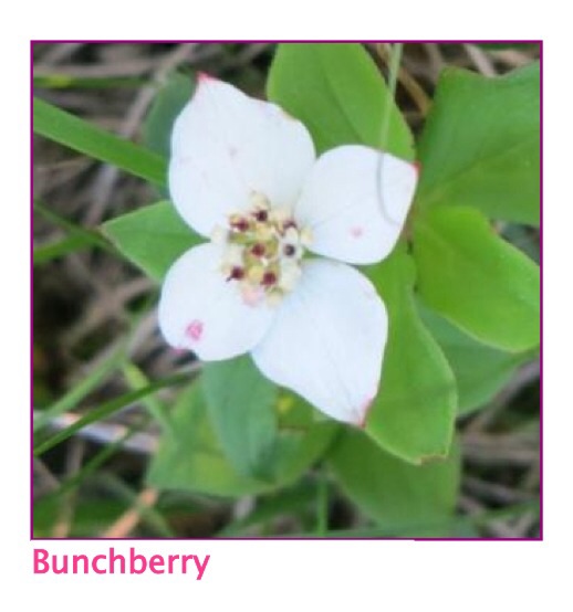 Our other little white wild flower is the bunchberry. If you look very closely at this flower you will see that the center contains a cluster of tiny mini flowers. Often you will see this flower around stumps or rotting wood and it can form a low growing dense groundcover. Later in our season it will develop bright red berries which are enjoyed by our deer, grouse and songbirds.